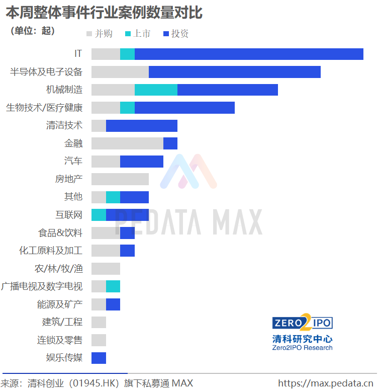 上周,IT、半导体及电子设备、机械制造行业的投资事件较多。