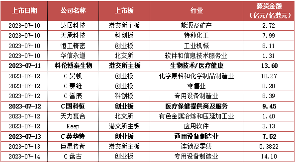 上周,有14家企业上市,总融资金额107.18亿人民币,上交所科创板2家、深交所创业板6家、北交所2家、港交所主板4家。