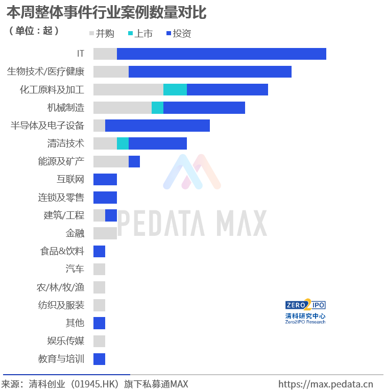 上周,IT、生物技术/医疗健康、化工原料及加工投资并购事件较多。