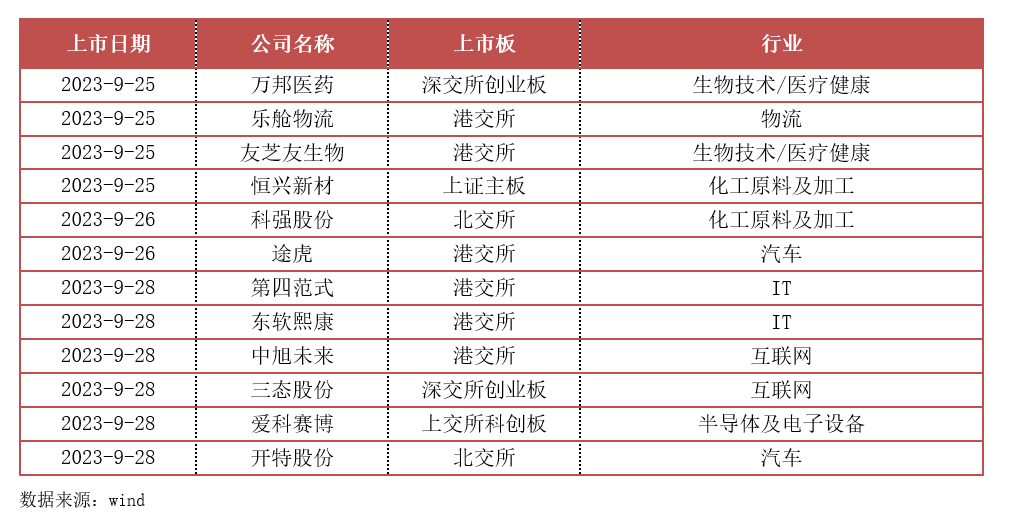 9月23日至9月28日,有12家企业上市,总融资金额78.98亿人民币,其中上交所2家、深交所创业板2家、北交所2家、港交所6家。