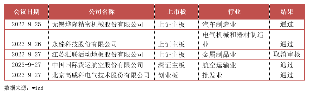上周,共5家企业经交易所、发审会审核,4家通过审核,1家取消审核。