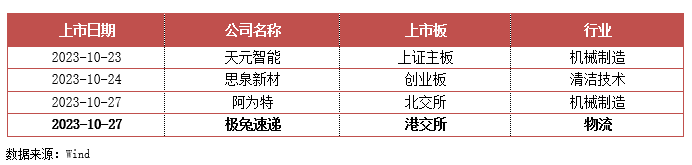上周,共有4家企业上市,总融资金额47.70亿元人民币,其中,上交所主板1家、深交所创业板1家、北交所1家、港交所1家。