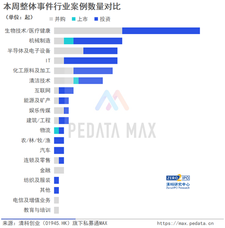 上周,生物技术/医疗健康、机械制造、半导体及电子设备投资并购事件较多。