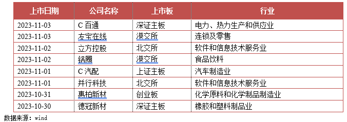 上周,本周有有8家企业上市,总融资金额39.87亿人民币,其中,上交所1家,深交所3家,北交所2家,港交所2家。