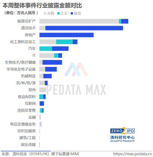 上周,能源及矿产、清洁技术、房地产行业的投资事件较多。