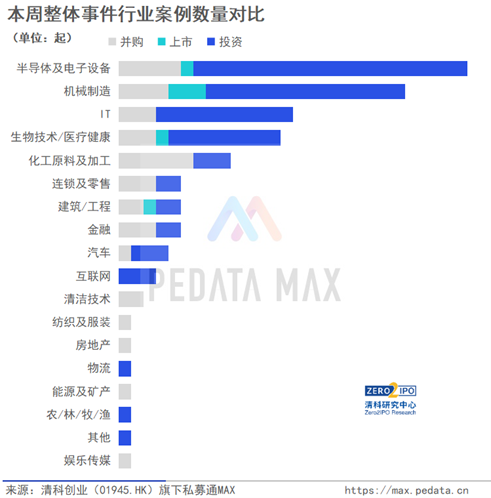 上周,半导体及电子设备、机械制造、IT投资并购事件较多。