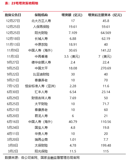 偿二代二期工程落地背景下,监管对于保险公司核心资本认定更加严格,保险公司的偿付能力充足率呈现明显下滑的趋势,部分保险公司因偿付能力不够充足而影响业务开展。在此背景下,各公司纷纷采取措施稳定和提升偿付能力充足率。今年以来,共有包括阳光保险、太保财险、瑞再企商、华贵人寿、国宝人寿、国寿海外、君龙人寿、汇丰人寿等在内的21家险企获批完成23笔增资,此外还有复星联合健康、华泰人寿、珠峰财险等11家险企已披露增资计划。