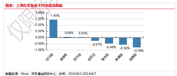 上周,国内基金涨跌不一,其中涨幅最大的是QDII型基金,涨幅为1.45%,跌幅最大的是指数型基金,下跌0.78%。