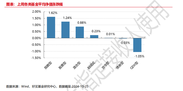 上周,国内基金涨跌不一,其中涨幅最大的是指数型,涨幅为 1.62%,涨幅最小的是 QDII 型,跌幅为-1.05%。