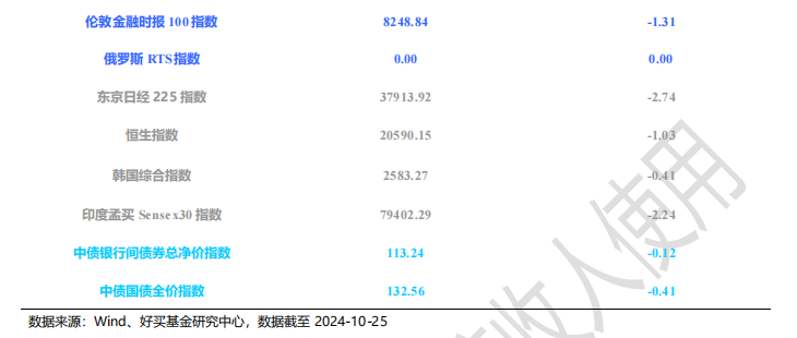上周,欧美主要市场普遍下跌,其中,道指下跌2.68%,标普500下跌0.96%;道琼斯欧洲50 下跌1.03%。亚太主要市场普遍下跌,其中,恒生指数下跌 1.03%,日经 225 指数下跌 2.74%,印度孟买 Sensex 30 指数下跌 2.24%。