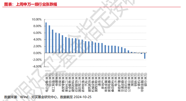 市场温和震荡:国内市场经过前期大涨后转入政策细节落地等待及效果观察阶段,海外方面聚焦特朗普交易,市场整体呈现震荡格局,上证指数,沪深 300、创业板分别上涨 1.17%、0.79%、2.00%,行业方面,电力设备、综合、轻工制造领涨,计算机、非银金融及银行领跌。