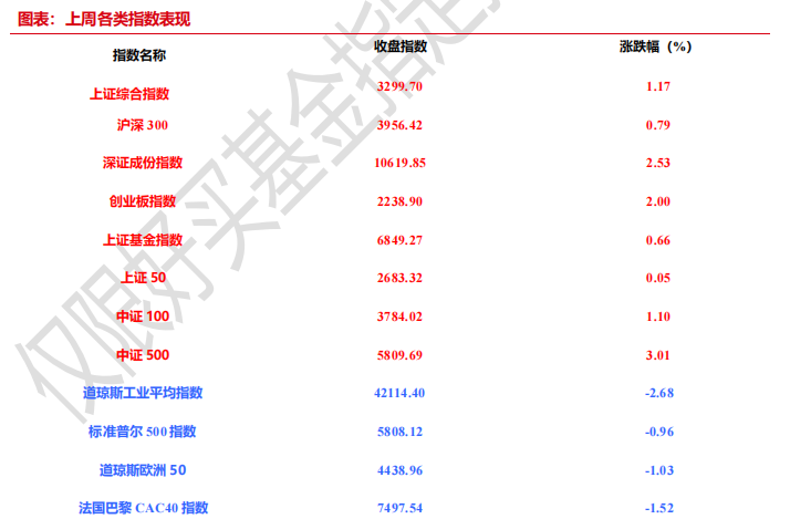 上周,沪深两市双双收涨。截止收盘,上证综指收于 3299.70 点,涨 38.14 点,涨幅为 1.17%;深成指收于 10619.85 点,涨 262.17 点,涨幅为 2.53%;沪深 300 收于 3956.42 点,涨 31.19 点,涨幅为 0.79%;创业板收于 2238.90点,涨43.80点,涨幅为2.00%。两市成交93160.50亿元。总体而言,小盘股强于大盘股。中证100上涨1.10%,中证500上涨3.01%。31个申万一级行业中有28个行业上涨。其中,电力设备(申万)、综合(申万)、轻工制造(申万)表现居前,涨跌幅分别为 9.10%、8.24%、6.95%,计算机(申万)、非银金融(申万)、银行(申万)表现居后,涨跌幅分别为-0.08%、-0.28%、-1.68%。