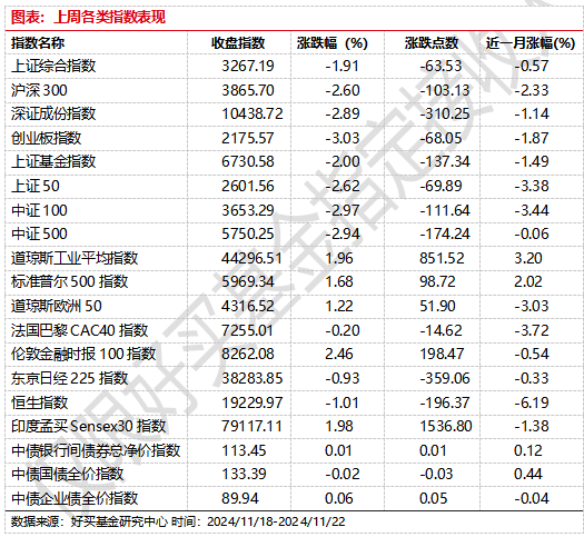 上周,欧美主要市场普遍上涨,其中,道指上涨1.96%,标普500上涨1.68%;道琼斯欧洲50 上涨1.22%。亚太主要市场涨跌不一,其中,恒生指数下跌1.01%,日经225指数下跌0.93%。