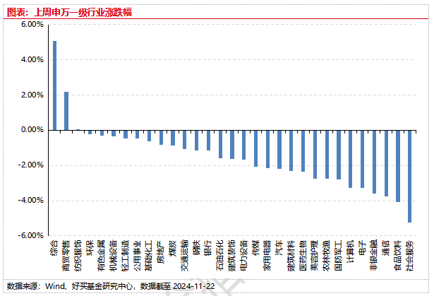 上周,沪深两市双双收跌。截止收盘,上证综指收于3267.19点,跌63.53点,跌幅为1.91%;深成指收于10438.72点,跌310.25点,跌幅为2.89%;沪深300收于3865.70点,跌103.13点,跌幅为2.60%;创业板收于2175.57点,跌68.05点,跌幅为3.03%。31个申万一级行业中有3个行业上涨。其中,综合、商贸零售、纺织服饰表现居前,涨跌幅分别为5.08%、2.18%、0.06%,通信、食品饮料、社会服务表现居后,涨跌幅分别为-3.78%、-4.08%、-5.24%。