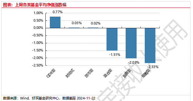 上周,国内基金普跌,其中指数型基金平均下跌2.33%,混合型和股票型平均下跌1.51%和2.03%。QDII基金平均上涨0.77%。