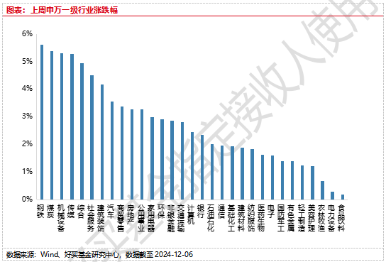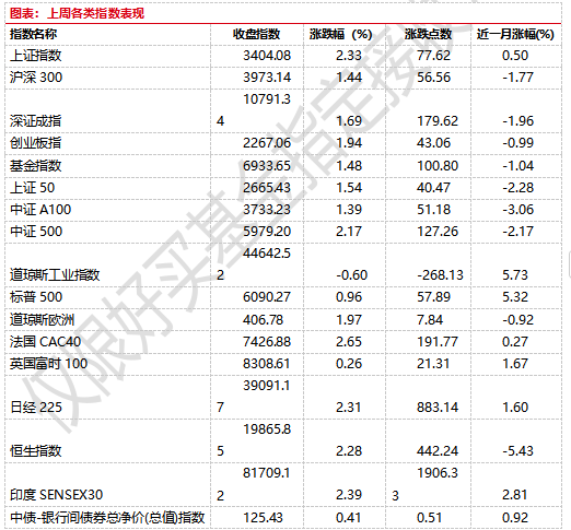 上周,沪深两市双双收涨。截止收盘,上证综指收于3404.08点,涨77.62点,涨幅为2.33%;深成指收于10791.34点,涨179.62点,涨幅为1.69%;沪深300收于3973.14点,涨56.56点,涨幅为1.44%;创业板收于2267.06点,涨179.62点,涨幅为1.94%。总体而言,大盘股弱于小盘股。中证100上涨1.39%,中证500上涨2.17%。31个申万一级行业全部上涨。其中,钢铁、煤炭、机械设备表现居前,涨跌幅分别为5.61%、5.39%、5.31%,食品饮料、电力设备、农林牧渔表现居后,涨跌幅分别为0.19%、0.29%、0.67%。