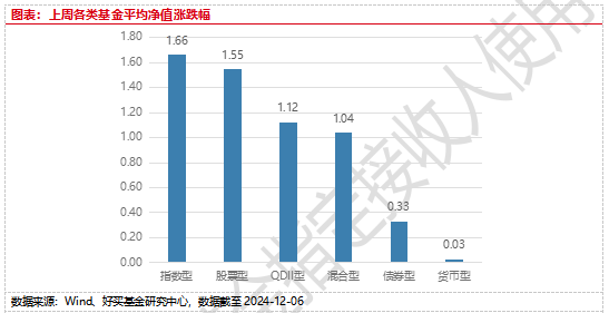 上周,国内基金普遍上涨,其中混合型基金平均上涨1.04%,指数型和股票型基金平均上涨1.66%和1.55%。QDII基金平均上涨1.12%。