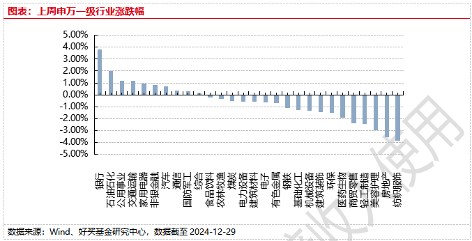 年底大小盘风格迎来切换,投资者风险偏好有所回落。以微盘股指数、中证2000指数为代表的小盘指数出现明显调整,主要有几方面原因:一是市场担忧新国九条退市新规生效。对此,证监会新闻发言人深夜发声,以维稳市场情绪;二是日历效应。临近1月份年报预告期,投资者风险偏好有所回落;三是前期积累的获利盘资金有所了结,表现为两市成交额、融资余额已有回落迹象。