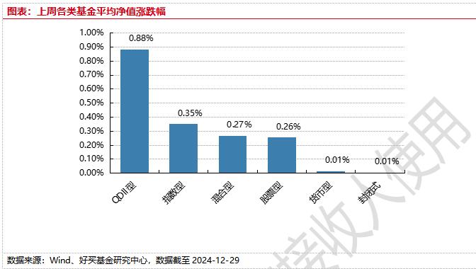 上周,国内基金全部上涨,其中QDII基金平均上涨1%,指数型和混合型基金平均上涨0.35%和0.27%,股票型平均上涨0.26%,债券型上涨0.07%。