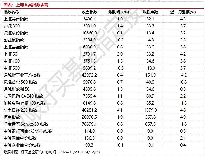 上周,欧美主要市场普遍上涨,其中,道指上涨0.35%,标普500上涨0.67%;道琼斯欧洲50上涨1.29%。亚太主要市场涨跌不一,其中,恒生指数上涨1.87%,日经225指数上涨4.08%,印度孟买Sensex30指数上涨0.84%。