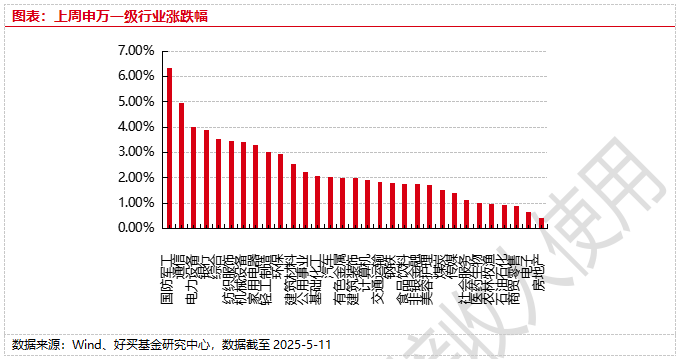 上周,沪深两市双双收涨。截止收盘,上证综指收于3342.00点,涨62.97点,涨幅为1.92%;深成指收于10126.83点,涨227.00点,涨幅为2.29%;沪深300收于3846.16点,涨75.59点,涨幅为2.00%;创业板收于2011.77点,涨63.74点,涨幅为3.27%。两市成交52898.75亿元。总体而言,大盘股强于小盘股。中证100上涨2.13%,中证500上涨1.60%。31个申万一级行业中有31个行业上涨。其中,国防军工、通信、电力设备表现居前,涨跌幅分别为6.33%、4.96%、4.02%,商贸零售、电子、房地产表现居后,涨跌幅分别为0.88%、0.64%、0.41%。