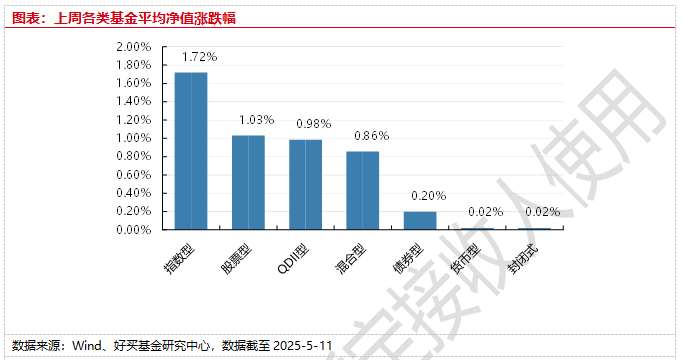 上周,国内基金全部上涨,其中股票型基金上涨1.03%,指数型上涨1.72%,混合型上涨0.86%,QDII基金上涨0.98%,债券型上涨0.2%。