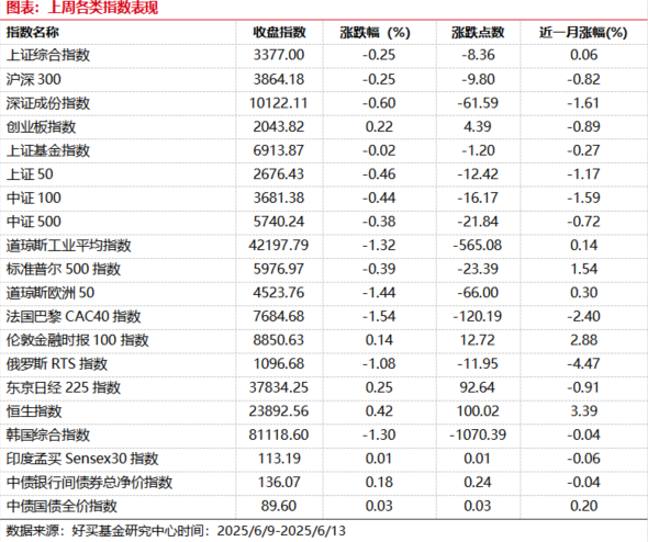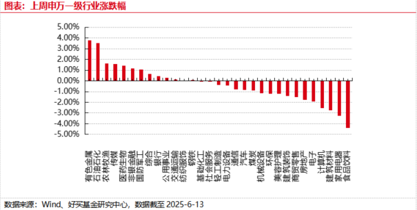 上周A股、港股指数先扬后抑,周五中东地缘冲突使得资金流出风险资产,全球股指普遍回调,国内权益市场也跟随调整。整体走势以横盘震荡、窄幅波动为主,并未明确选择方向。A股市场成交额放量,主要指数多数收跌,仅创业板指、微盘股指上涨;北证50、科创50领跌。近期中美伦敦谈判进展符合市场预期,但中东地缘局势再次扰动全球风险偏好,A股短期跟随震荡调整。