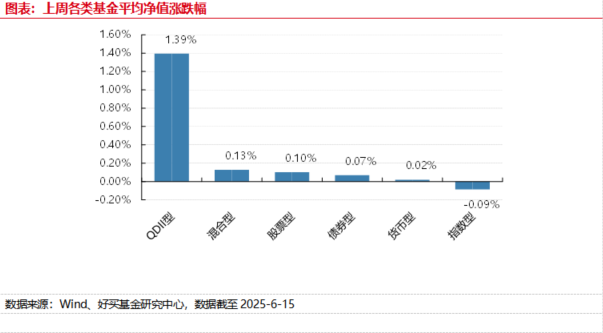 上周,国内基金涨跌不一,其中QDII型上涨1.39%,混合型上涨0.13%,股票型基金上涨0.10%,指数型下跌-0.09%。
