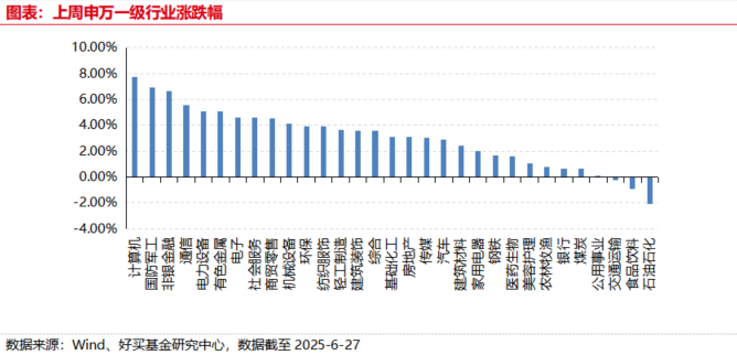 上周港股表现较好,恒指/恒生科技指数分别上涨3.2%/4.06%;欧美主要市场普遍上涨,其中标普500上涨3.44%,纳指100上涨4.2%,MSCI欧洲上涨3.04%;亚太市场普涨,印度sensex30上涨2%,日经225指数上涨4.55%。