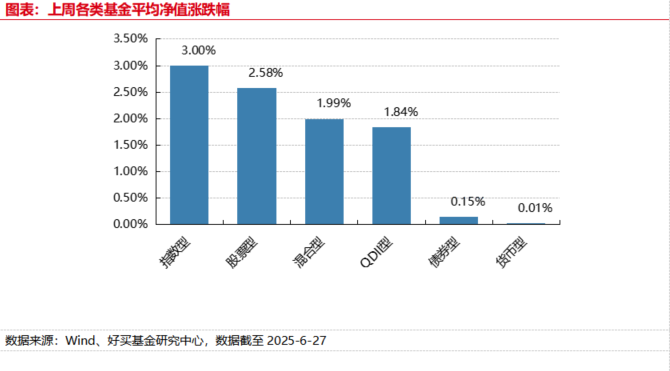 上周,国内权益基金普遍上涨,其中指数型基金平均上涨3%,股票型和混合型基金平均分别上涨2.58%和1.99%。
