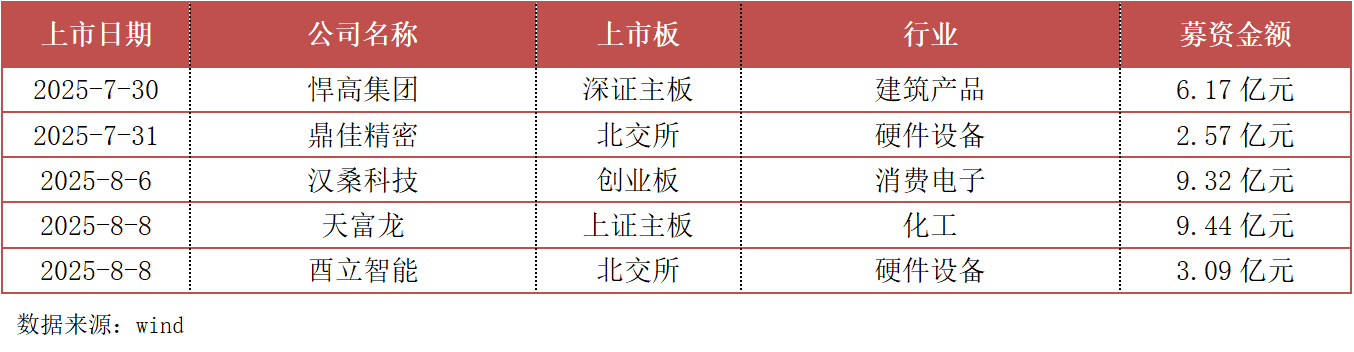 前两周,共有5家企业上市,其中上交所主板1家、深交所主板1家、深交所创业板1家、北交所2家。