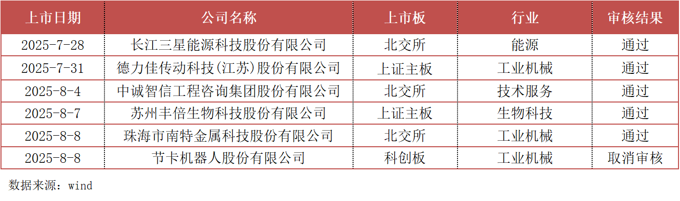 前两周,共有6家企业上会,5家通过,1家取消审核。