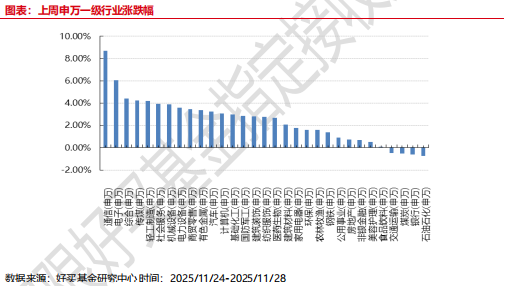 市场修复显著,科技领涨:上周中美两国元首通话,很大程度上平稳了短期动荡的外部预期,同时降息分 歧有所收敛,9 月非农数据超预期之下市场对于 12 月降息预期大幅降低,但近期联储释放出更多对劳动力市场的担忧,降息预期有所抬升,考虑联储独立性的逐步走弱,市场开始重新开始交易降息,谷歌最新模型一定程度上平抑了 AI 泡沫论的担心,对市场风险偏好的修复也形成了一定支撑,科技板块修复显著,部分个股创出历史新高,上证指数,沪深 300、创业板分别上涨 1.40%、1.64%、4.54%,行业方面,通信、电子、综合领涨, 煤炭、银行及石油石化领跌。