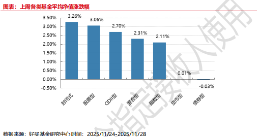 上周,国内基金涨跌不一,其中涨幅最大的是封闭式基金,涨幅为 3.26%,涨幅最小的是债券型,涨幅为- 0.03%。