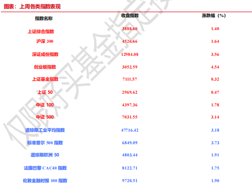 上周,沪深两市双双收涨。截止收盘,上证综指收于 3888.60 点,涨 53.71 点,涨幅为 1.40%;深成指收于 12984.08 点,涨 446.01 点,涨幅为 3.56%;沪深 300 收于 4526.66 点,涨 73.05 点,涨幅为 1.64%;创业板收于 3052.59 点,涨 132.51 点,涨幅为 4.54%。两市成交 86188.57 亿元。总体而言,小盘股强于大盘股。中证100上涨1.78%,中证500上涨3.14%。31个申万一级行业中有27个行业上涨。其中,通信(申万)、 电子(申万)、综合(申万)表现居前,涨跌幅分别为 8.70%、6.05%、4.43%,煤炭(申万)、银行(申万)、石油石化 (申万)表现居后,涨跌幅分别为-0.51%、-0.59%、-0.73%。