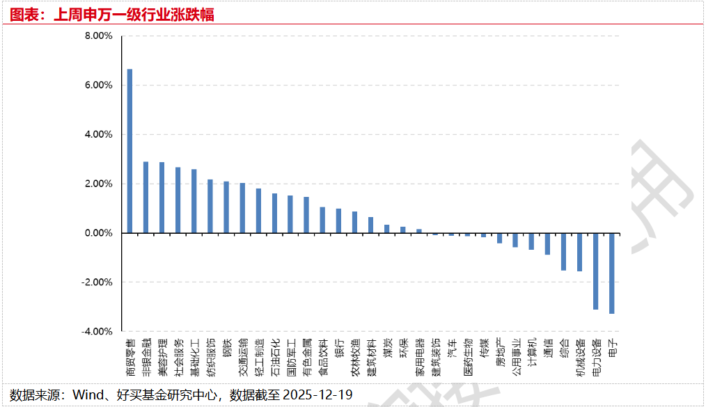 上周,沪深两市涨跌互现。截止收盘,上证综指收于3890.45点,涨1.10点,涨幅为0.03%;深成指收于13140.21点,跌118.11点,跌幅为0.89%;沪深300收于4568.18点,跌12.77点,跌幅为0.28%;创业板收于3122.24点,跌72.12点,跌幅为2.26%。两市日均成交1.74万亿元。总体而言,小盘股强于大盘股。中证100下跌0.82%,中证500下跌0.00%。31个申万一级行业中有19个行业上涨。其中,商贸零售、非银金融、美容护理表现居前,涨跌幅分别为6.66%、2.90%、2.87%,机械设备、电力设备、电子表现居后,涨跌幅分别为-1.56%、-3.12%、-3.28%。
