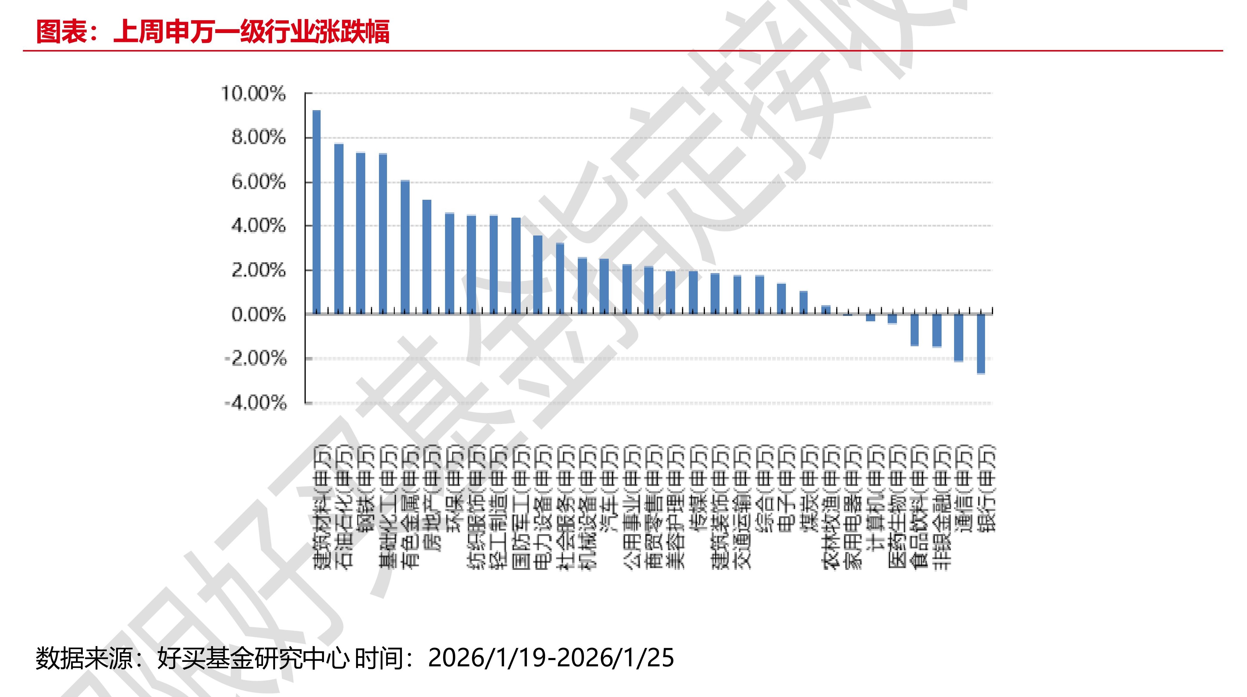 市场延续上涨,内需板块领涨:上周由于格陵兰岛的地缘问题影响,欧美市场波动较多,国内尽管实体数据较为一般,同时监管有意控制过热的市场情绪,但市场风险偏好未受影响,各种热点频出,市场持续向好,对流动性较为敏感的中证 500、中证 1000 分别上涨2.89%、4.34%,行业方面,建材、石油石化、钢铁领涨,非银、银行、金融领跌。