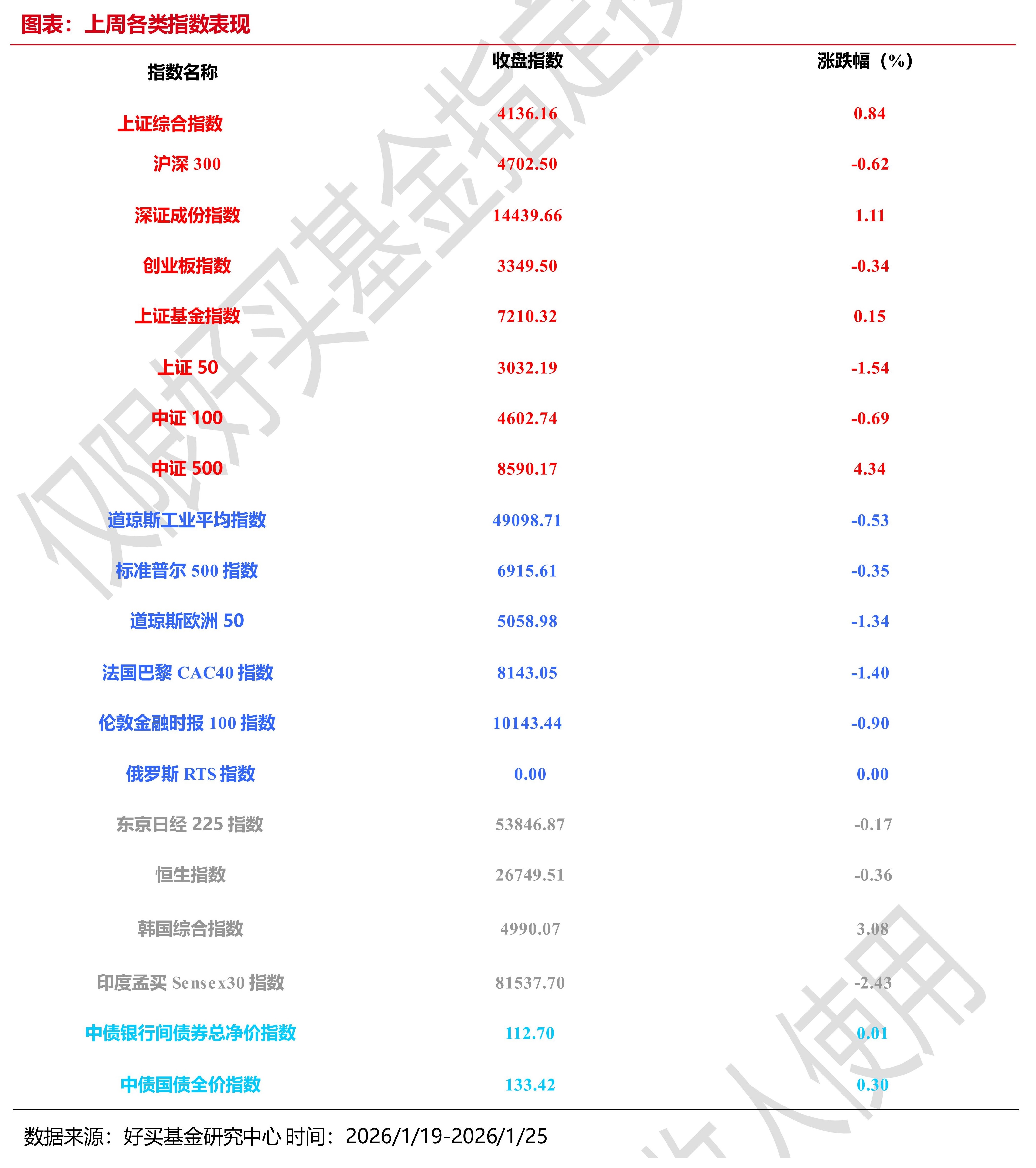 上周,欧美主要市场普遍下跌,其中,道指下跌 0.53%,标普500 下跌0.35%;道琼斯欧洲50 下跌1.34%。亚太主要市场涨跌不一,其中,恒生指数下跌 0.36%, 日经 225 指数下跌 0.17%。