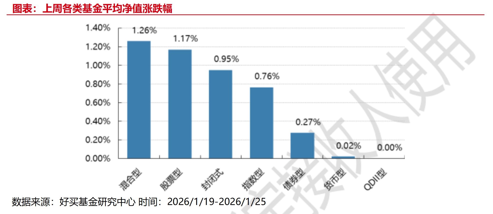 上周,国内基金涨跌不一,其中涨幅最大的是混合型基金,涨幅为1.26%,涨幅最小的是 QDII 型,涨幅为0.00%。