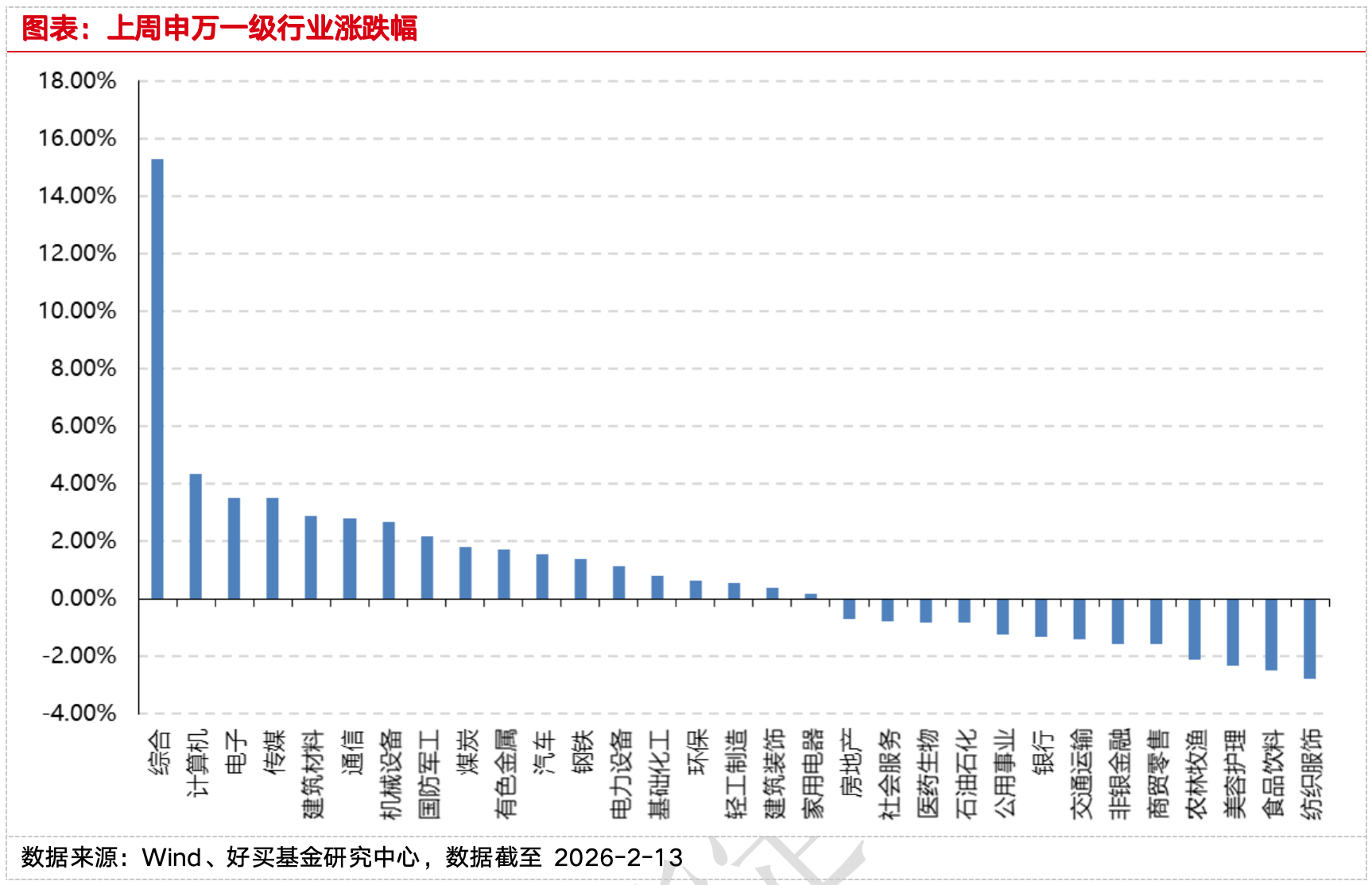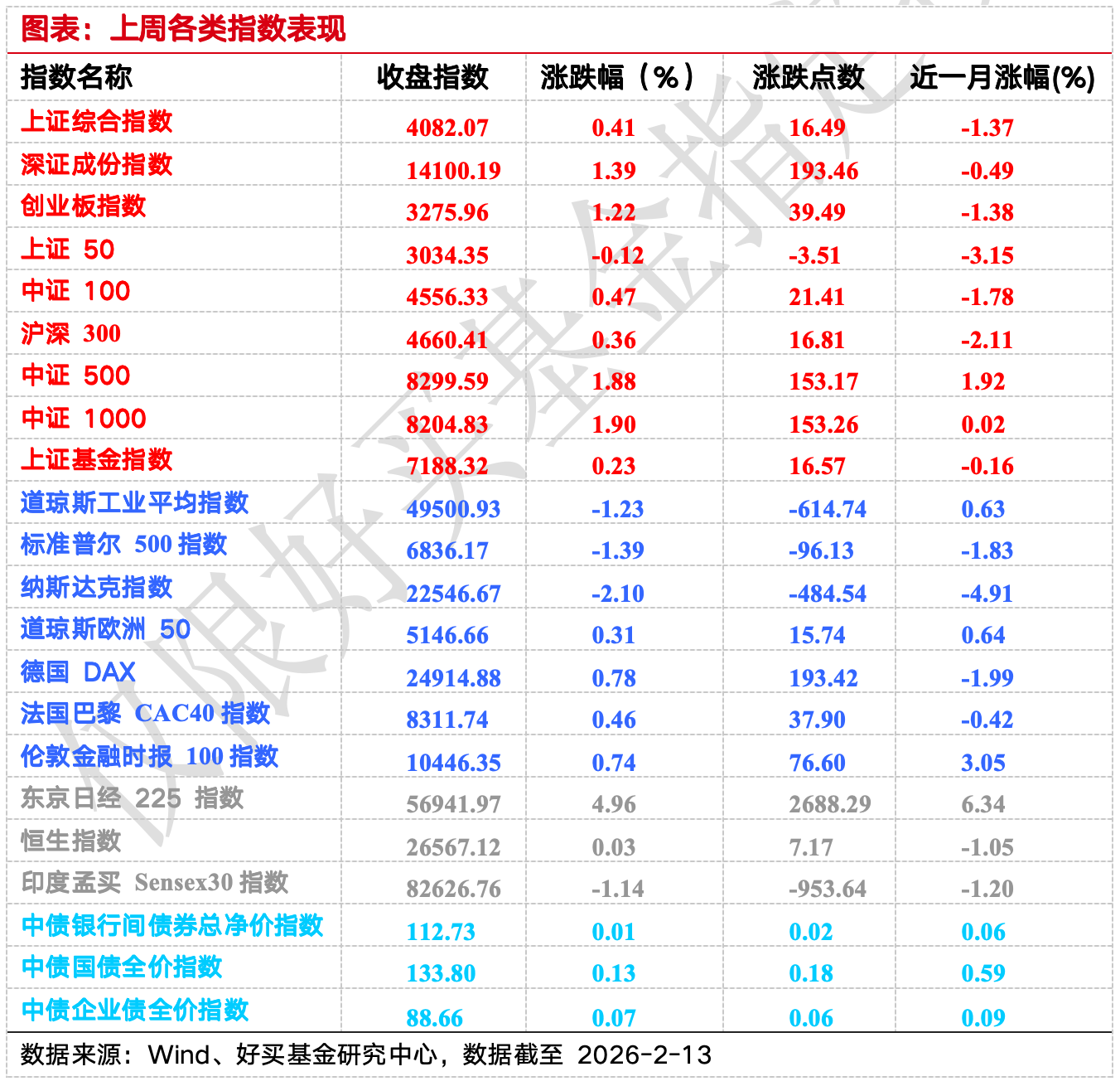 金融数据:M1、M2同比回升,信贷同比少增,企业部门是主要拖累。根据央行公布的 2026 年 1 月金融统计数据,M1 同比从 3.8%升至 4.9%,M2 同比增速从 8.5%升至 9.0%,以 M2 同比-社融同比(剔除股权融资和政府债券)测算的剩余流动性从 2.3%回升 至 3.0%,对应今年以来小盘相对占优的行情,截至 2/13 国证 2000 涨 9.1%,显著跑赢沪深 300 的 0.7%。流动性回升背后,除过低基数效应之外,主要两点:一方面是信贷“开门红”投放与资金回流带动存款增长,另一方面政府债券融资前置、财政支出节奏靠前, 对社融与流动性形成托底。信贷方面,1 月人民币贷款增加 4.7 万亿元,同比少增 4200 亿,结构上居民部门同比多增 127 亿,企业部门同比少增 3300 亿。