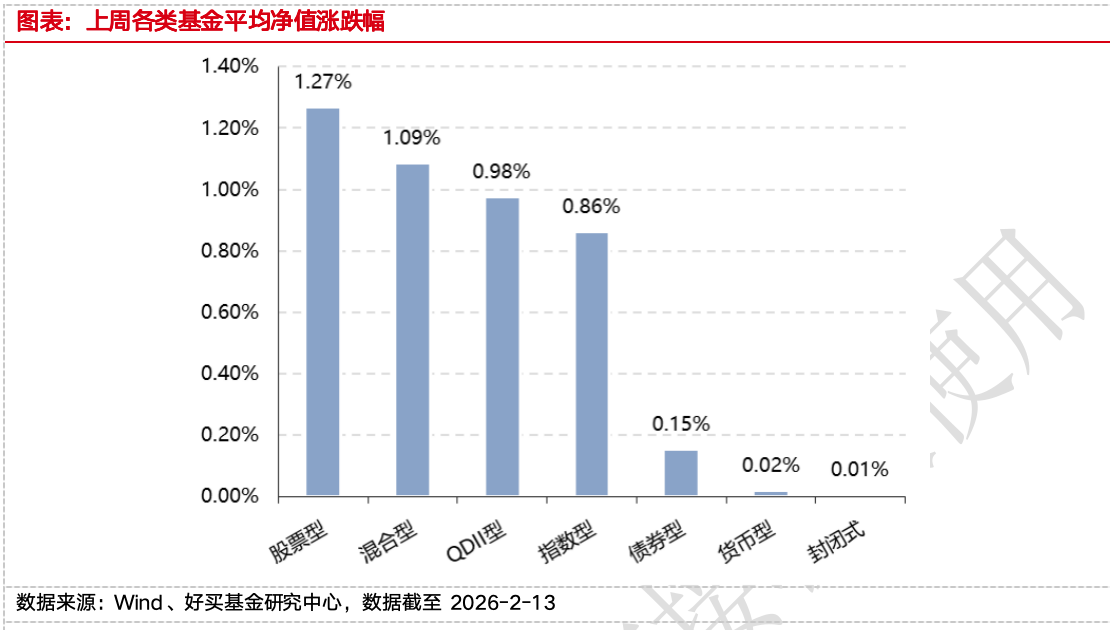 上周,国内权益基金多数上涨,其中股票型基金平均上涨1.27%,混合型和指数型基金平均分别上涨1.09%和0.86%。QDII基金平均上涨0.98%。