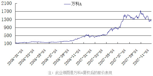 2006-2007年,主线是券商、金融、地产。投资吉林敖东、长江电力、白云机场、招商银行、工商银行等,其中仓位最重的是万科A。下图为重仓股万科A在牛市中的业绩表现: