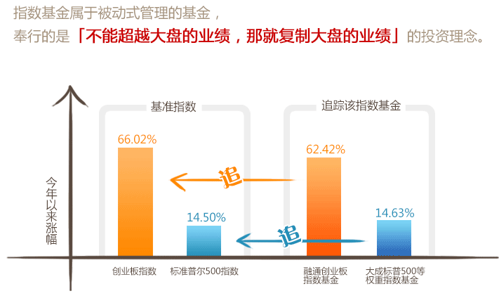- 指数基金属于被动投资,投资者不用担心因基金经理的选股能力从而造成基金业绩不佳。投资者看到指数基金跟踪的目标指数(例如创业板指数)的波动幅度,就会知道自己所投资的指数基金净值的大致波动幅度,绝对不会出现指数涨了,自己的基金净值却不怎么涨,或者大幅度落后于指数涨幅的情况。